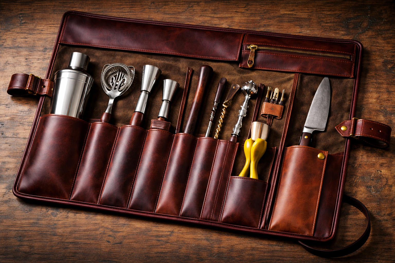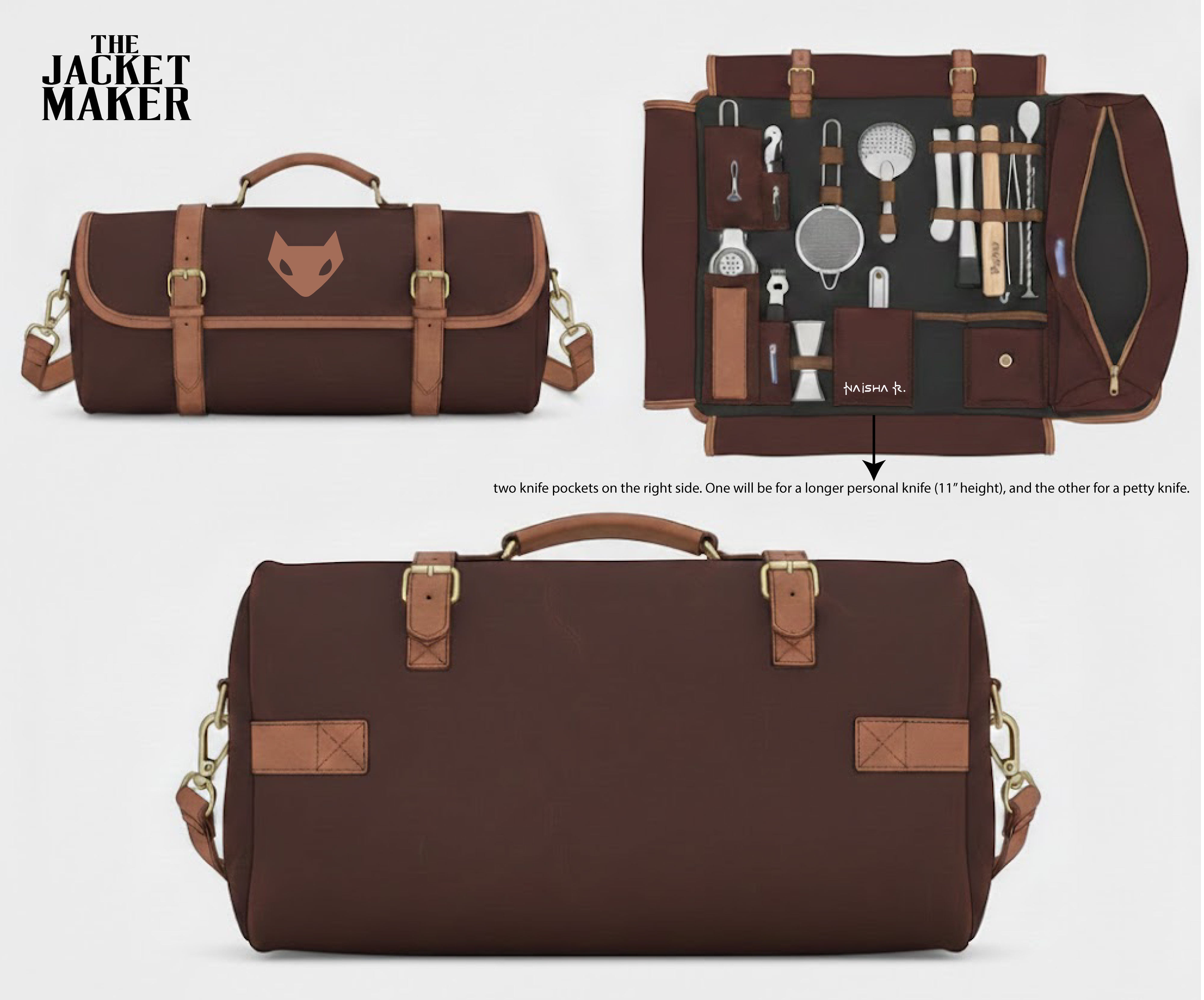• Inside Pockets: Two knife pockets on the right side. One will be for a longer personal knife (11" height of the knife) with the embroidered initials "Naisha R.", and the other for a petty knife. (as per the illustration)